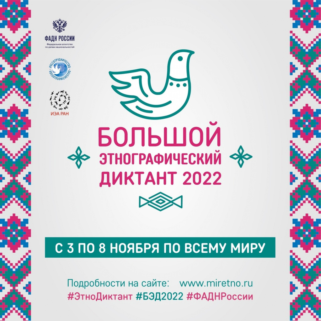 «Большой этнографический диктант 2022» — это Всероссийская акция просветительская акция, которая позволит оценить уровень этнографической грамотности населения, их знания о народах, проживающих в Российской Федерации.