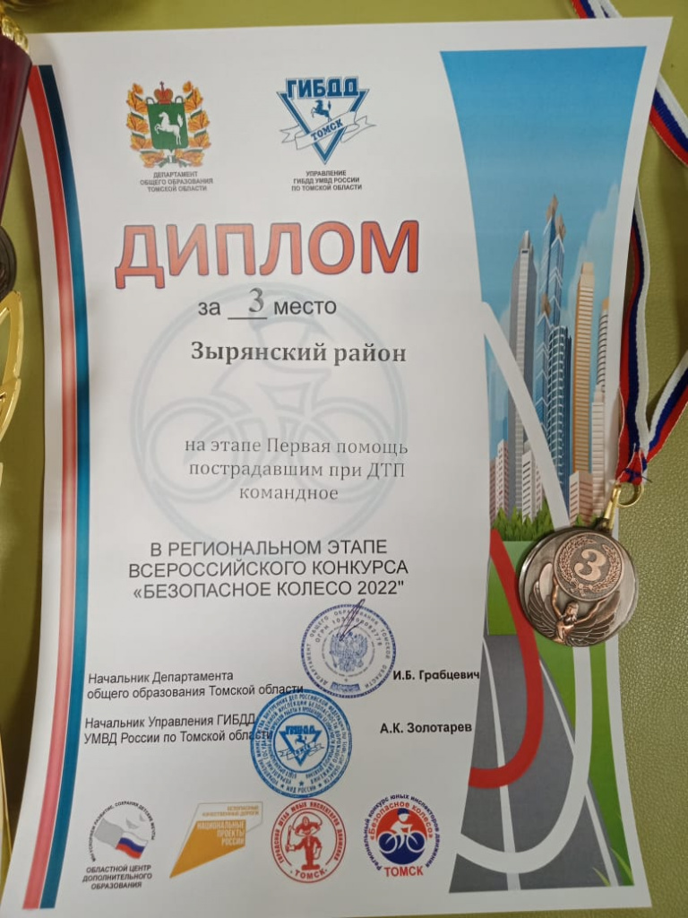 Областной этап Всероссийского конкурса “Безопасное колесо” Posted on 17.05.2022by uozyrКатегории:Воспитание 11 и 12 мая 2022 года в г. Томск прошел областной этап Всероссийского конкурса “Безопасное колесо”. Команда Зырянского района заняла 3 место на этапе Первая помощь пострадавшим при ДТП. Примите наши поздравления. uozyr